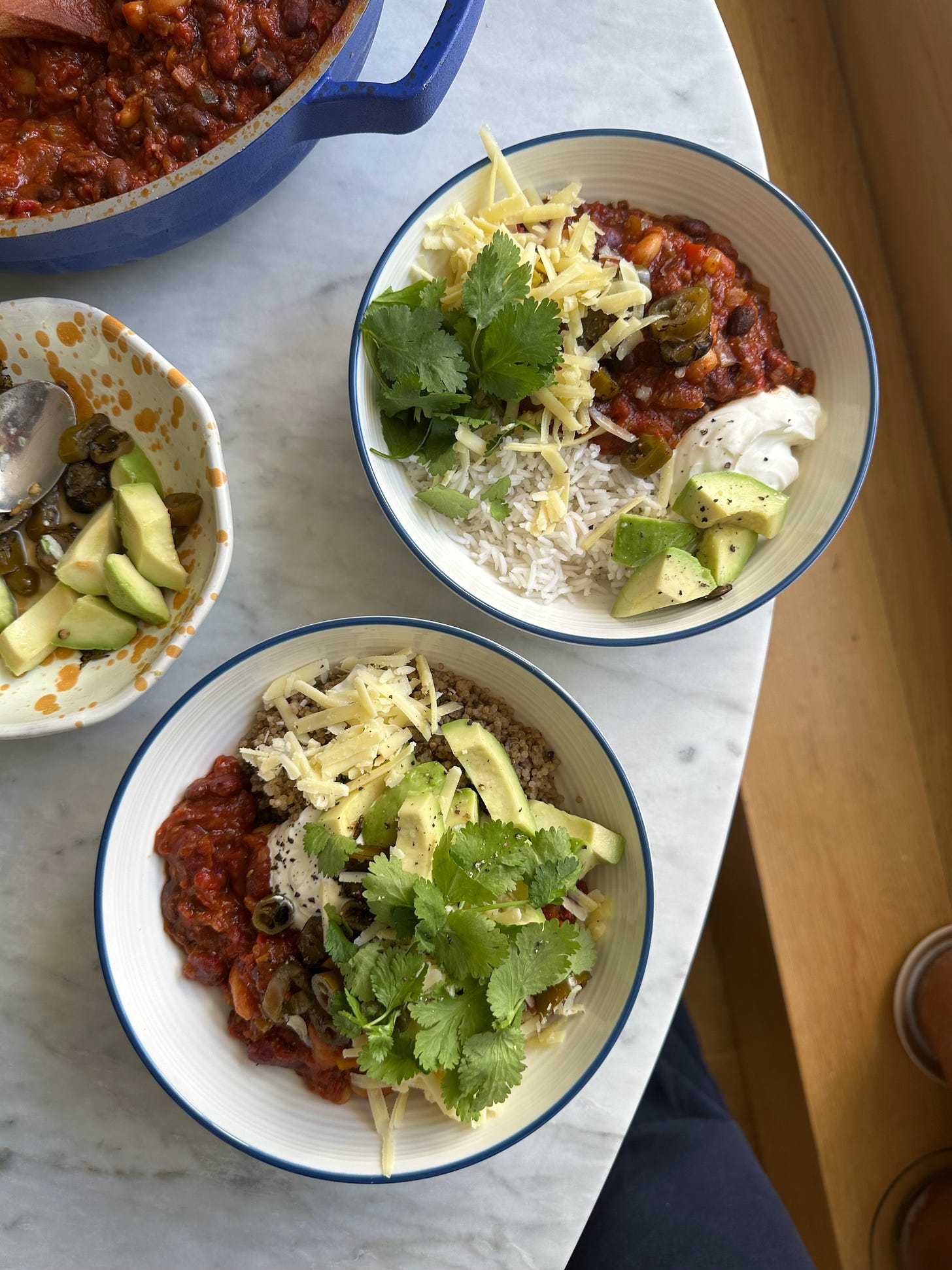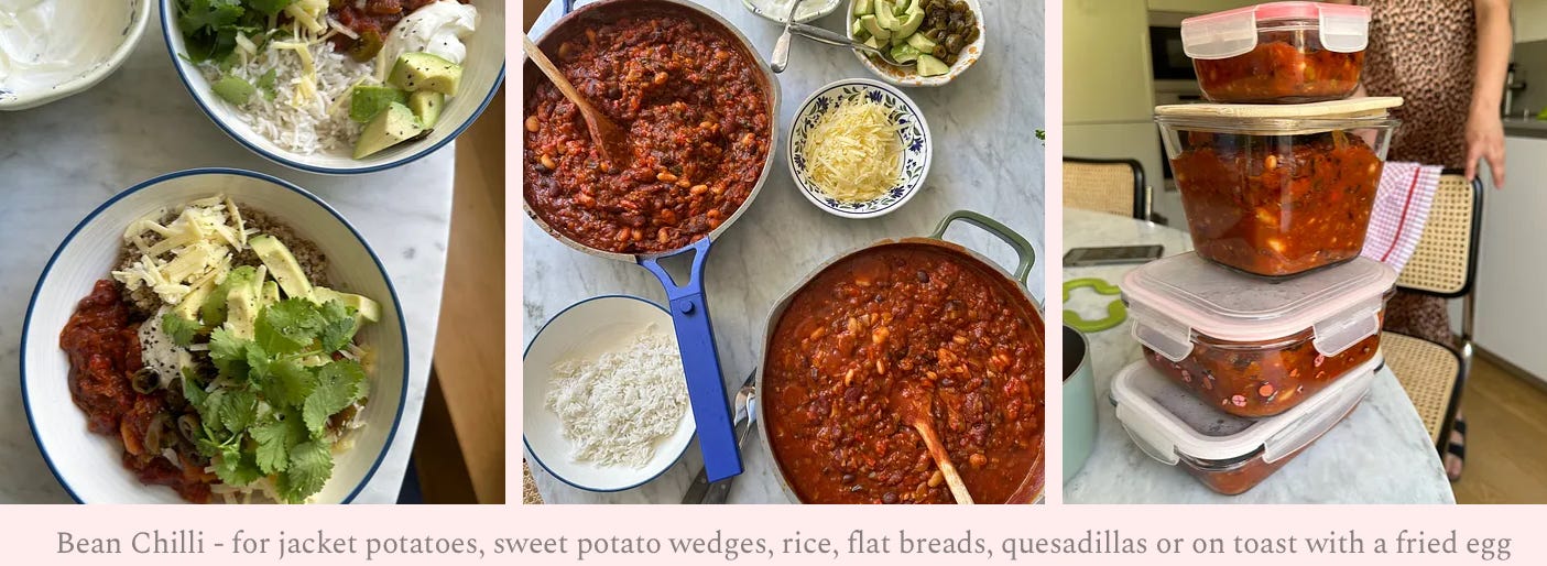 Give it a go, a a gift to your future self. Big batch bean chilli is the sort of batchable recipe I rely on and simmer up once a month to help ease my mental load and physical load with a reliable stock of delicious healthy dinners. Freeze in containers for a rainy day or for those evenings when you simply don’t have the energy to do anymore than reheat and put your feet up.