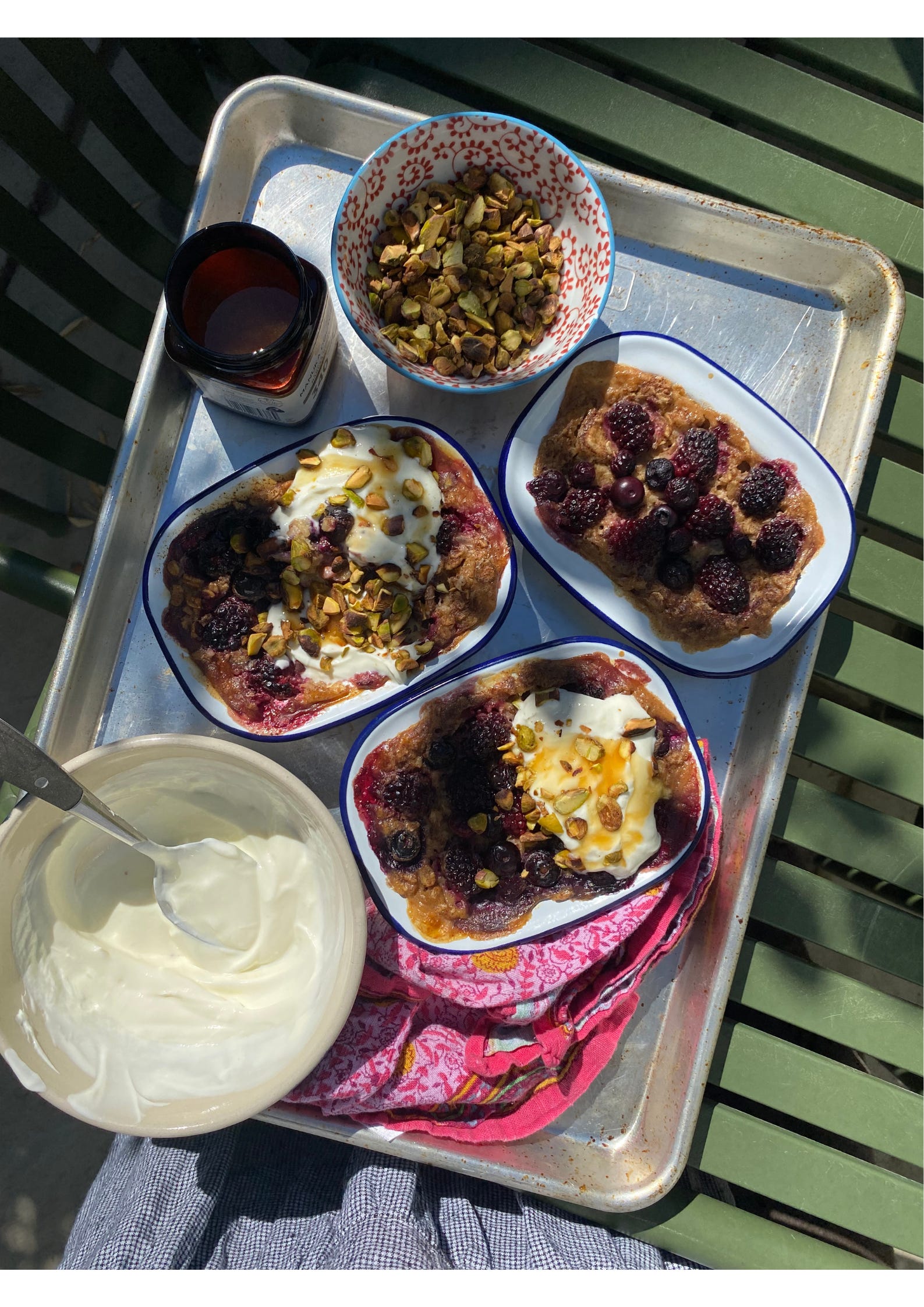 Mix all the ingredients (except for the berries and the ingredients for serving) together in a bowl, then transfer to the dishes and top with the berries. Bake for about 25 minutes or until golden at the edges.