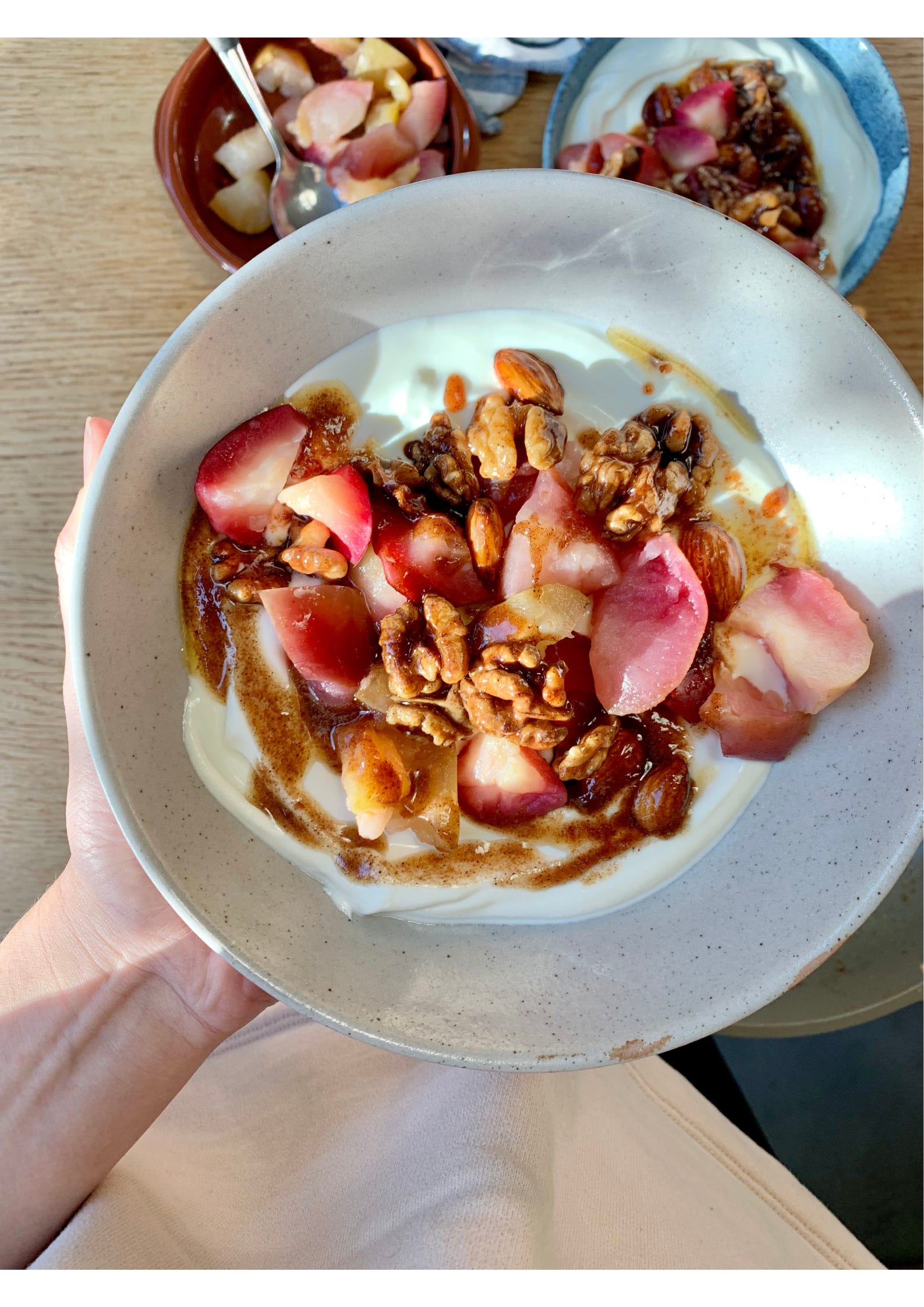 Remove the dishes from the oven, dollop with yoghurt and a little extra honey or maple syrup, if you like, and enjoy straight from the dishes.