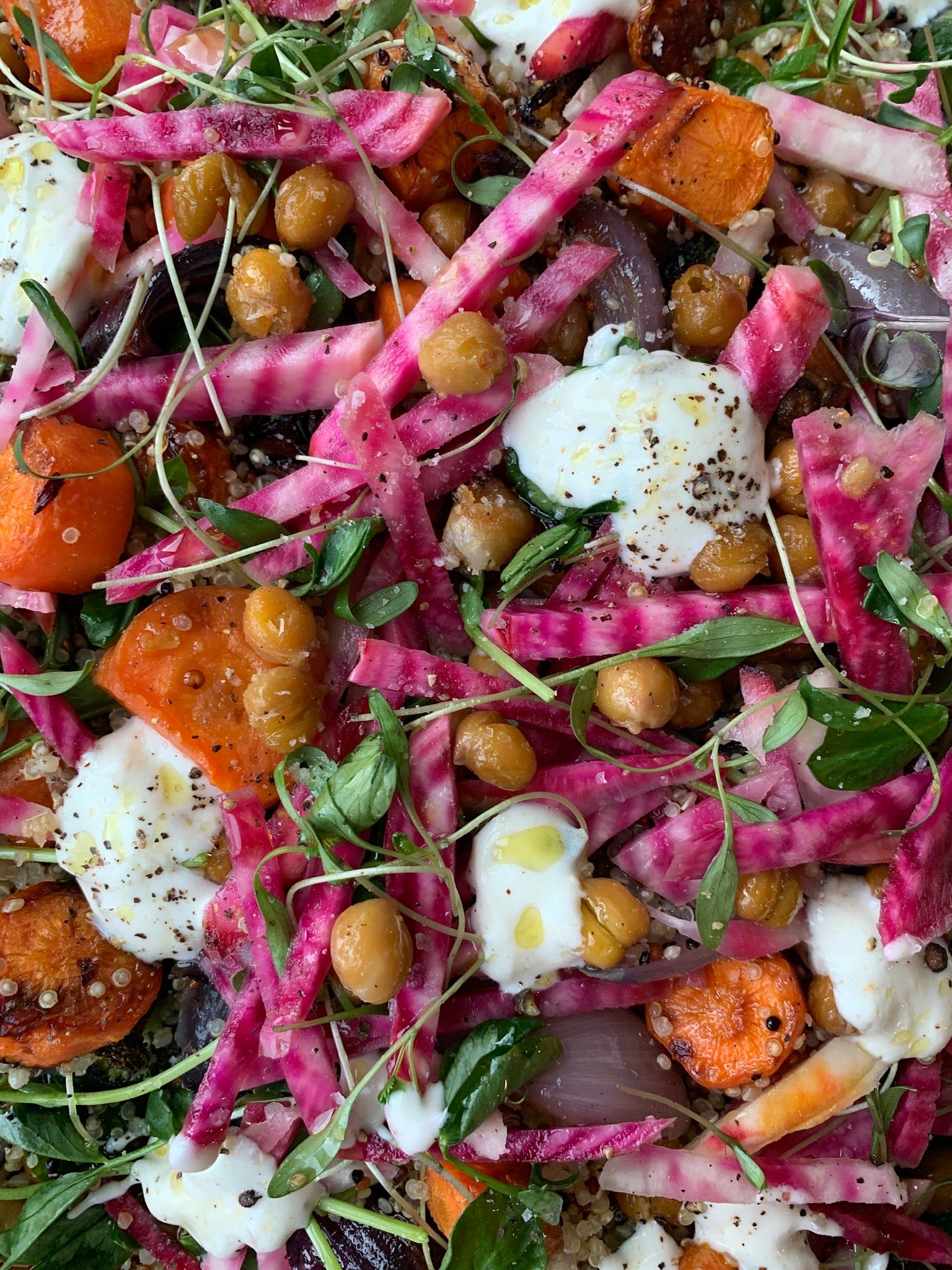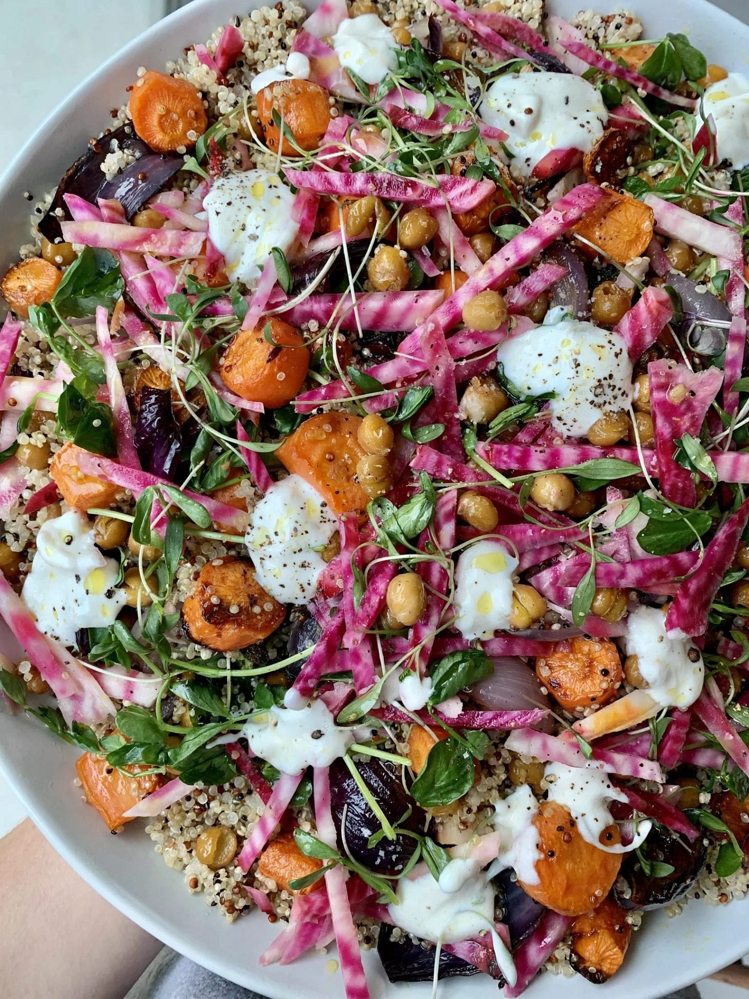 This big, hearty and quite beautiful beetroot salad does just the job on colder Spring days. Celebrating spring ingredients, this salad has the best textures with crispy chickpeas, roasted carrots, fresh crunchy beets & creamy yoghurt.