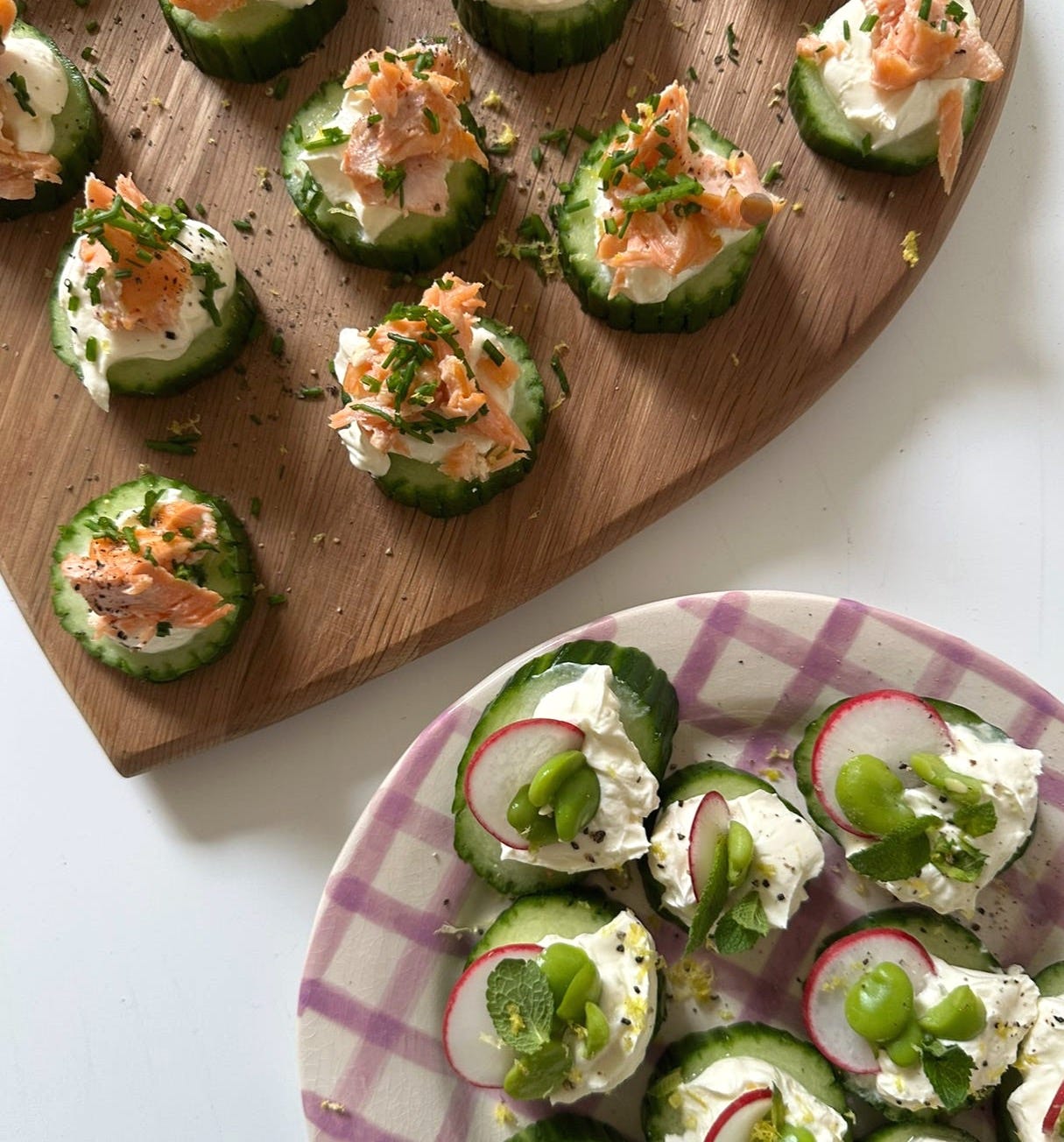 Cucumber bites with smoked trout & chives or radishes with mint & lemon
